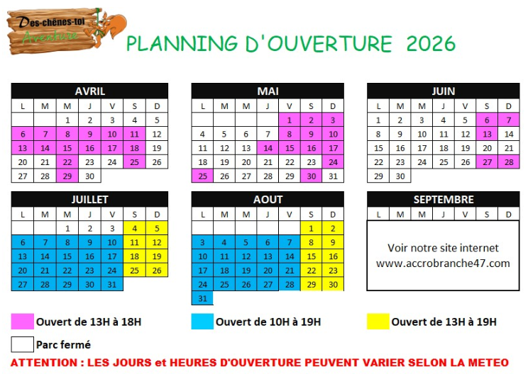 - Vacances Zone A : - du 6 avril à début juillet, selon calendrier consultez notre site internet pour les petites vacances, jours fériés et week-end