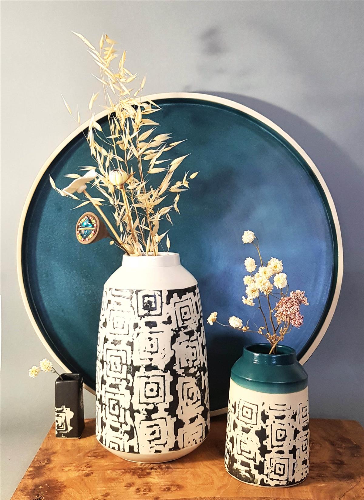 Je travaille un grès blanc, mes pièces sont pour la plupart tournées ou montées à la plaque, les cuissons s'effectuent dans un four électrique en autoconsommation pour ce qui est du dégourdi, 980°C, pour la cuisson des émaux, 1300°C, j'utilise un four à gaz.