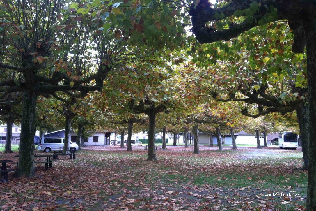 Aire municipale gratuite sous les arbres, calme avec des commerces, à proximité . WC à la turque sur l'aire ainsi que robinets d'eau potable.