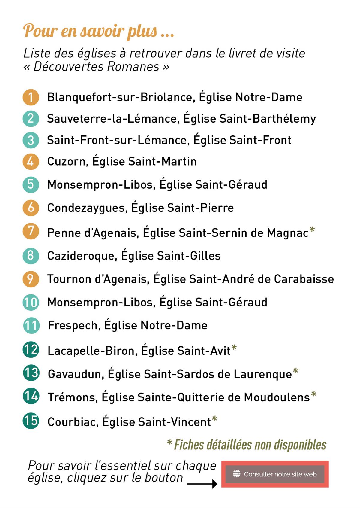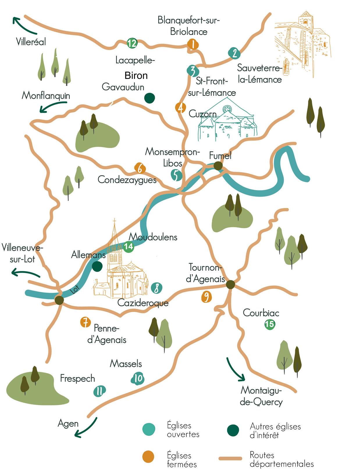 Ce circuit « Découvertes Romanes » vous propose une promenade au rythme de vos envies, de flâner de villages en villages, et de le conjuguer aux multiples propositions définies par l’Office de Tourisme Fumel-Vallée du Lot, élargissant votre curiosité dans les domaines du patrimoine, de la gastronomie, de la promenade et des randonnées de notre territoire.