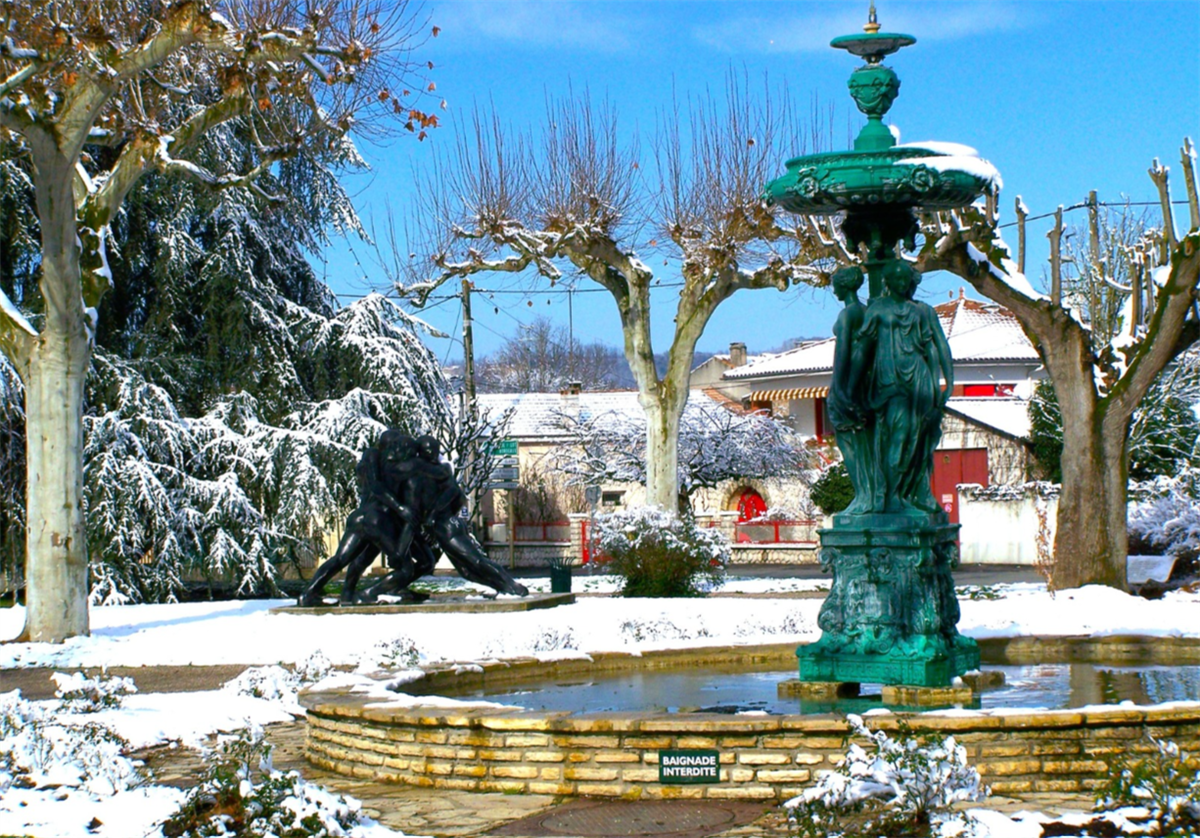 Optez pour une halte arborée à Aiguillon ! Pour une pause rafraîchissante ou une envie de souffler, le Jardin des Droits de l'Homme est parfait : petit coin de verdure au milieu de la ville, le jardin présente une jolie fontaine où les Trois Grâces veillent avec sérénité sur les promeneurs. Cette fontaine était, jusque dans les années 60, située en face du château ducal. Elle a été coulée en fonte de fer dans les ateliers Ducel et Fils, en 1850. Le socle et le groupe de femmes sont un moulage de ceux du monument funéraire du cœur d'Henri II.