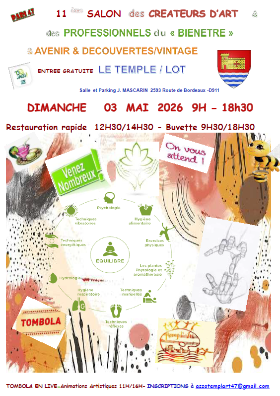 L'association Templ'art organise son 11ᵉ Salon des créateurs d'art et des professionnels du bien-être : techniques énergétiques et vibratoires, hydrologie, hygiène respiratoire, alimentaire, aromathérapie, psychologie...