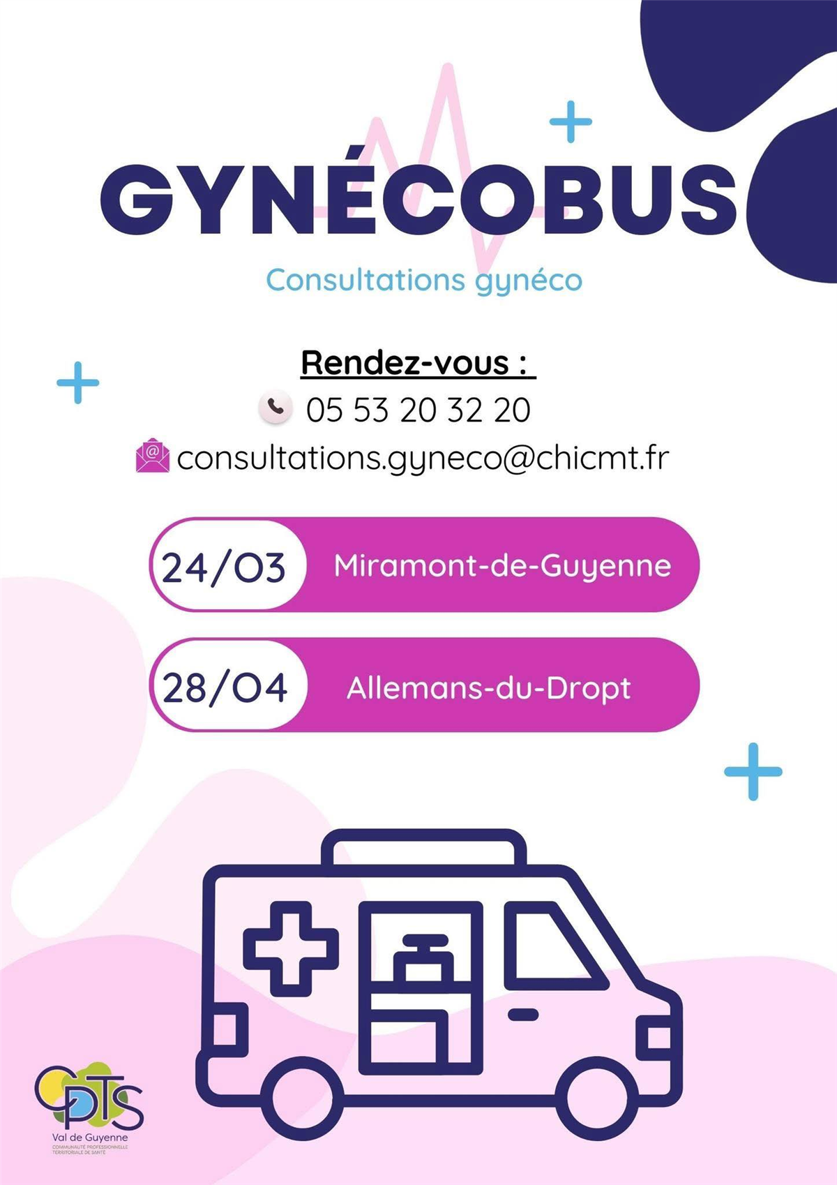 La Communauté territoriale de professionnels de santé Val de Guyenne, en partenariat avec le Centre hospitalier de Marmande, organise des consultations gynécologiques dans le tout nouveau Médicobus. Une sage-femme ou un gynécologue vous accueille dans le bus pour une consultation. La prise de rendez-vousest obligatoire et se fait au secrétariat de gynécologie du CHICMT en précisant "Gynécobus".