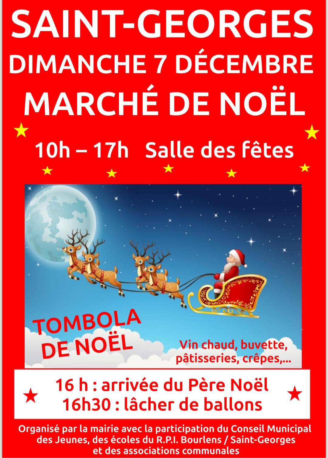 Marché de Noël organisé par la Mairie avec la participation du Conseil Municipal des jeunes, des écoles du RPI Bourlens/ Saint-Georges et des associations communales avec vin chaud, buvette, pâtisseries, crêpes à 16h arrivée du Père-Noël et 16h30 lâcher de ballons.