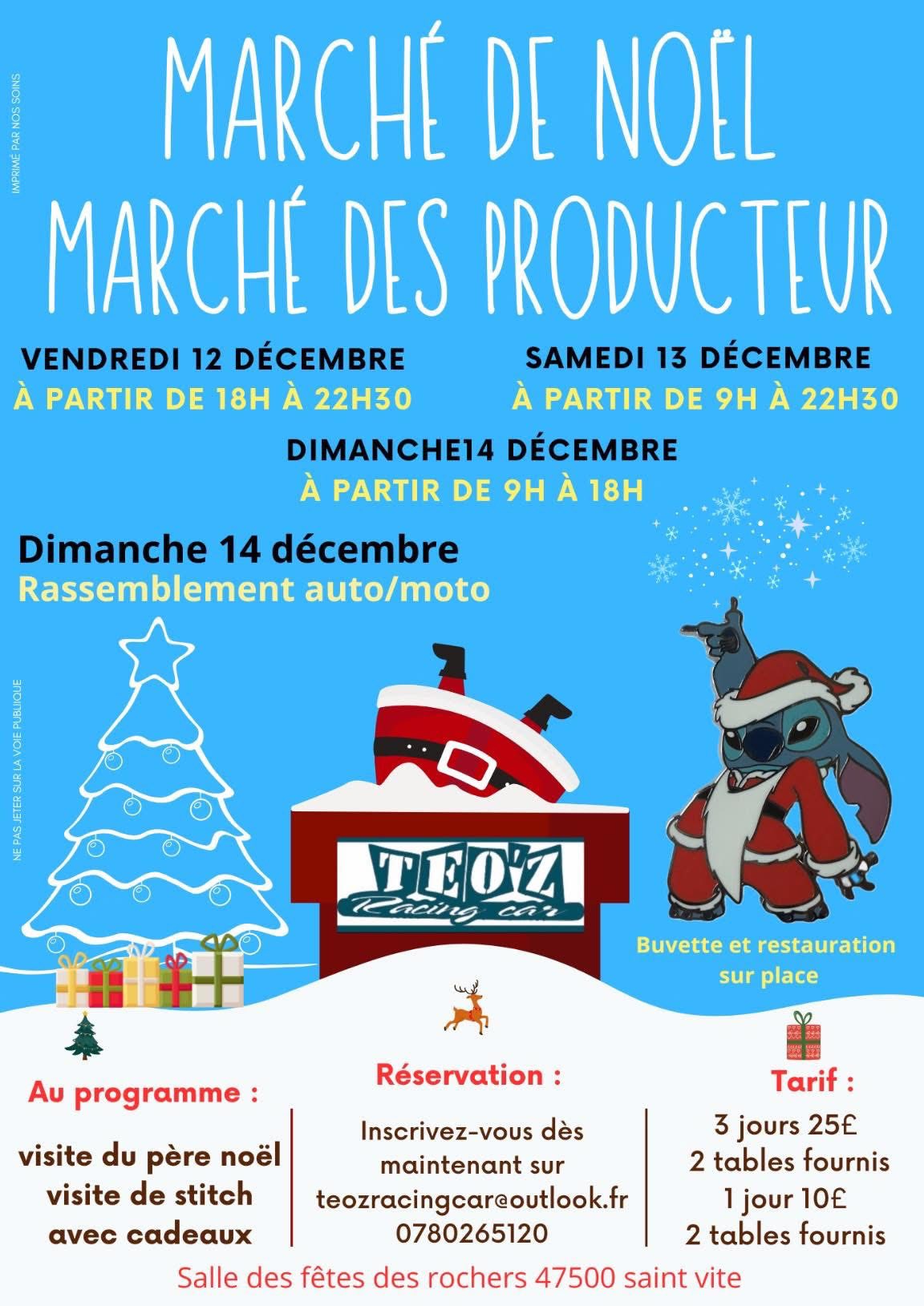 Teoz racing car organise un marché de Noël et des producteurs au programme visite du Père-Noël et de Stitch avec des cadeaux. Buvette et restauration sur place. Dimanche rassemblement auto/moto.