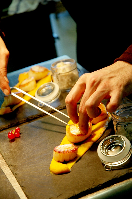 Noix de Saint Jacques rôties au safran du Lot et Garonne, polenta et endives braisées