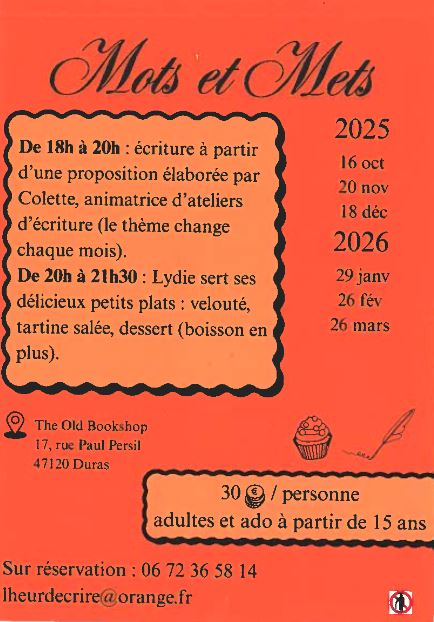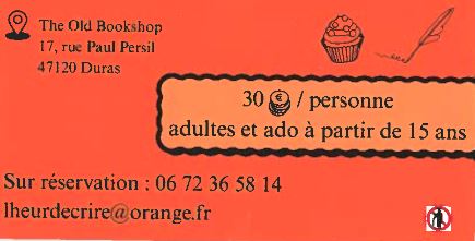 De 18h à 20h : écriture à partir d'une proposition élaborée par Colette, animatrice d'ateliers d'écriture (le thème change chaque mois) et de 20h à 21h30 : Lydie (The Old Bookshop) sert ses délicieux petits plats : velouté, tartine salée, dessert (boisson en plus)