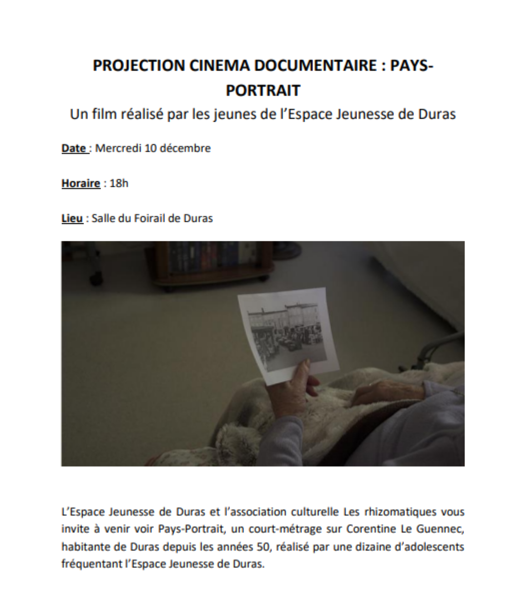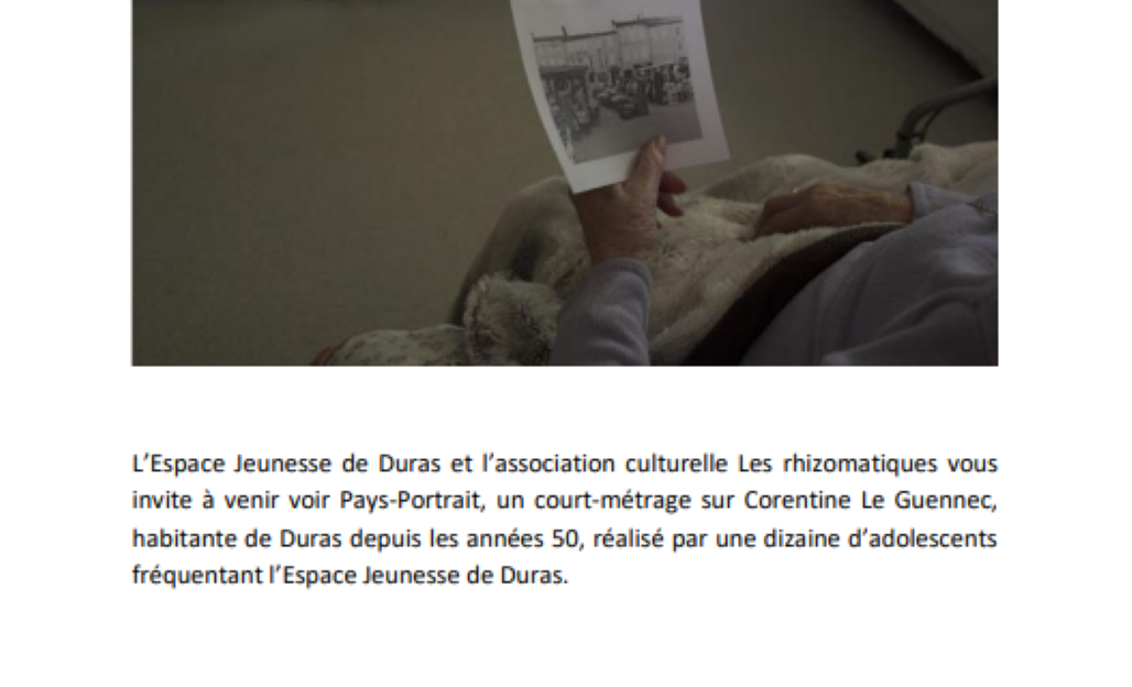 L’Espace Jeunesse de Duras et l’association Les Rhizomatiques ont proposé aux jeunes de participer à un atelier cinématographique du lundi 27 octobre au vendredi 31 octobre. Ils ont été invités à réaliser un court métrage documentaire intitulé Pays-Portrait, ayant pour objectif de mettre en lumière une personne de leur village qu’ils considèrent comme intéressante ou exemplaire.