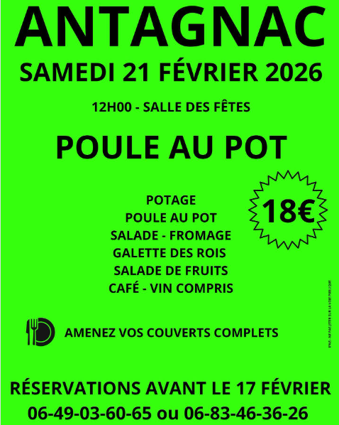 Menu : apéritif, potage, poule et ses légumes, salade/fromage, galette des rois/salade de fruits, vin et café compris.