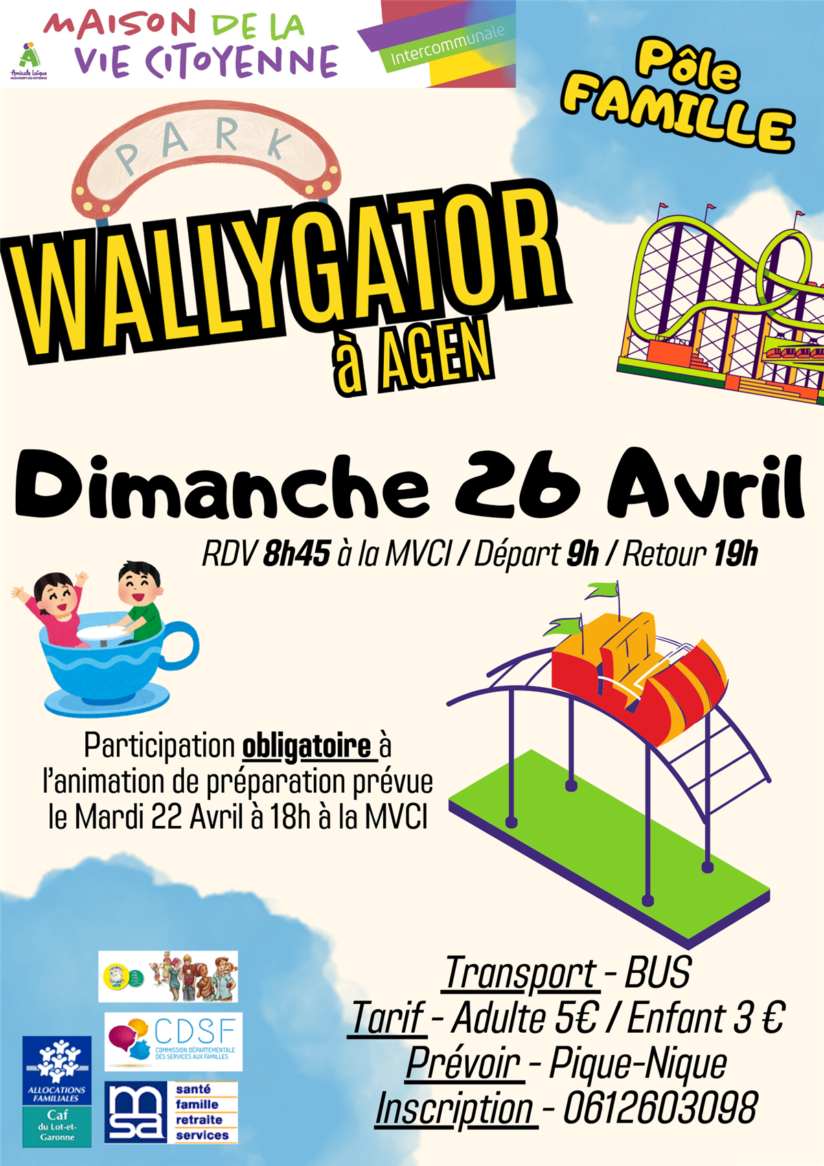 La Maison de la Vie Citoyenne Intercommunale organise une sortie au parc Walligator à Agen ! Une participation obligatoire est demandé pour les préparations le mardi 22 avril à 18h à la MVCI, pour le bon déroulement de l'animation nous vous demandons du soutiens pour l'oganisation. Transport en bus compris depuis Miramont. prévoir un Pique-nique.