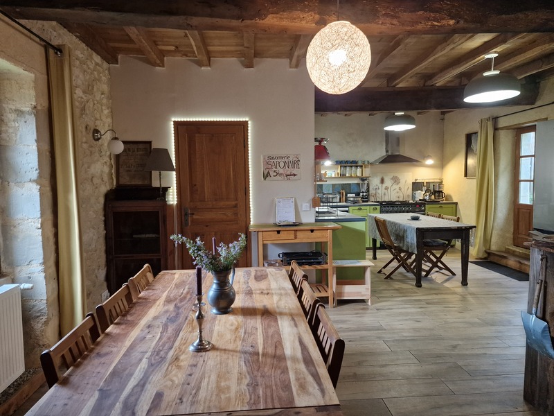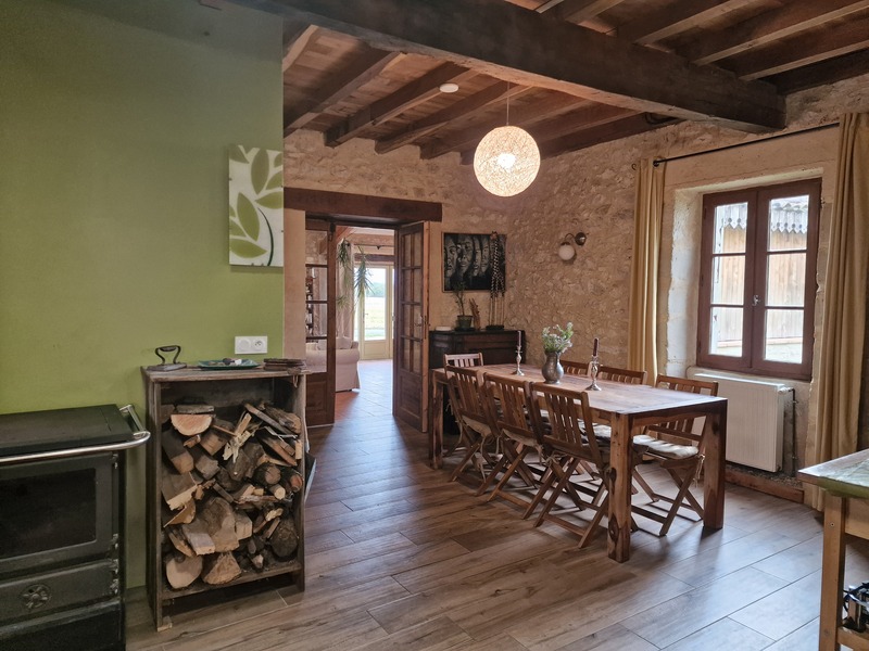 Cuisine avec espace repas, poêle bouilleur qui alimente les radiateurs.
