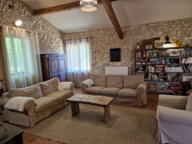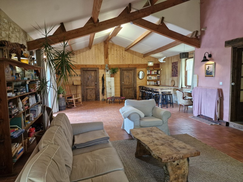 Grand salon/séjour de 60m², avec poêle à bois, TV, canapés, coin livres & jeux, espace apéro avec table haute, piano électrique, mini trampoline.