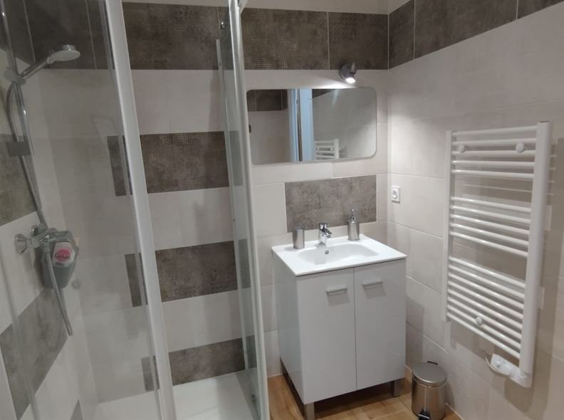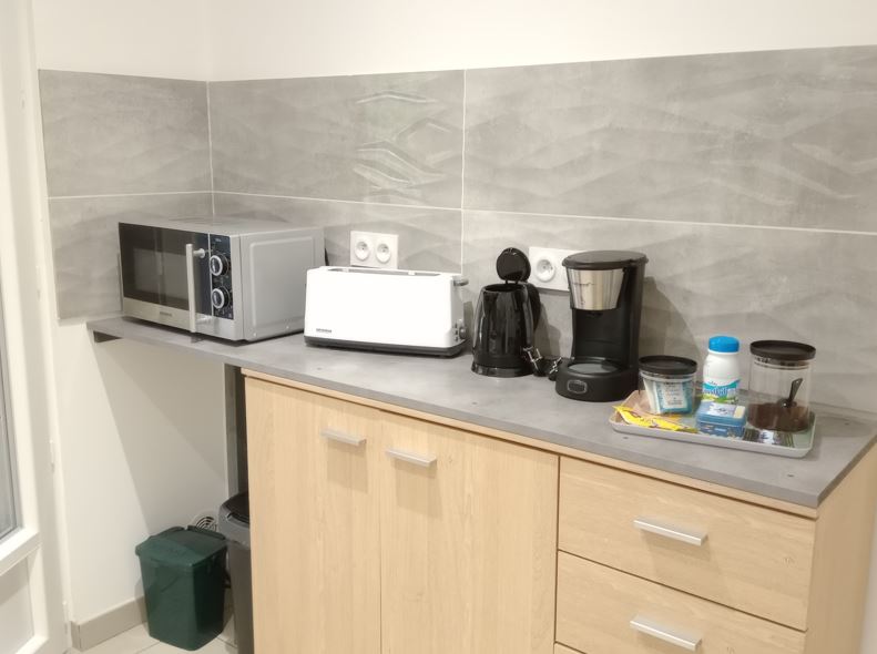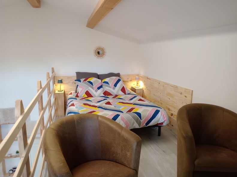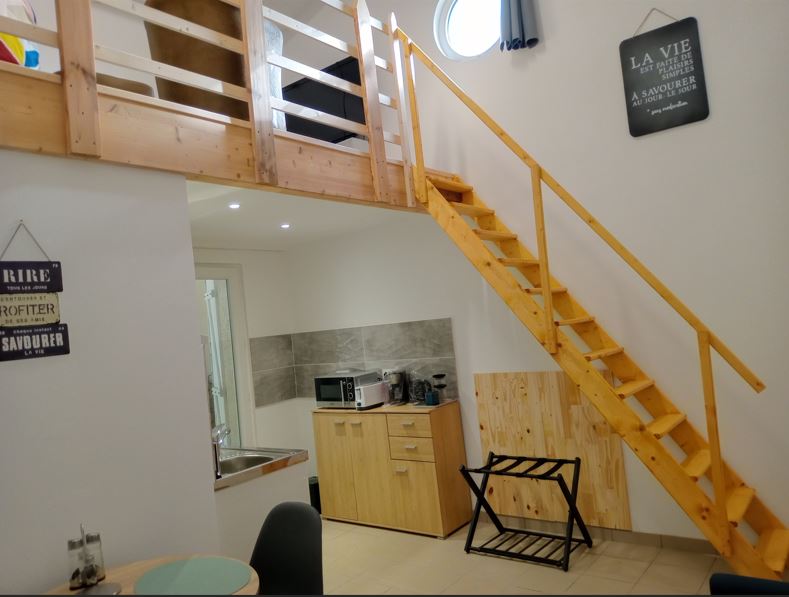 Le logement est équipé d'une kitchenette, de deux terrasses, une chambre en mezzanine avec un lit double, salle d'eau avec sanitaire et un jacuzzi à partir de mi-avril.