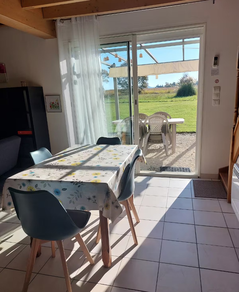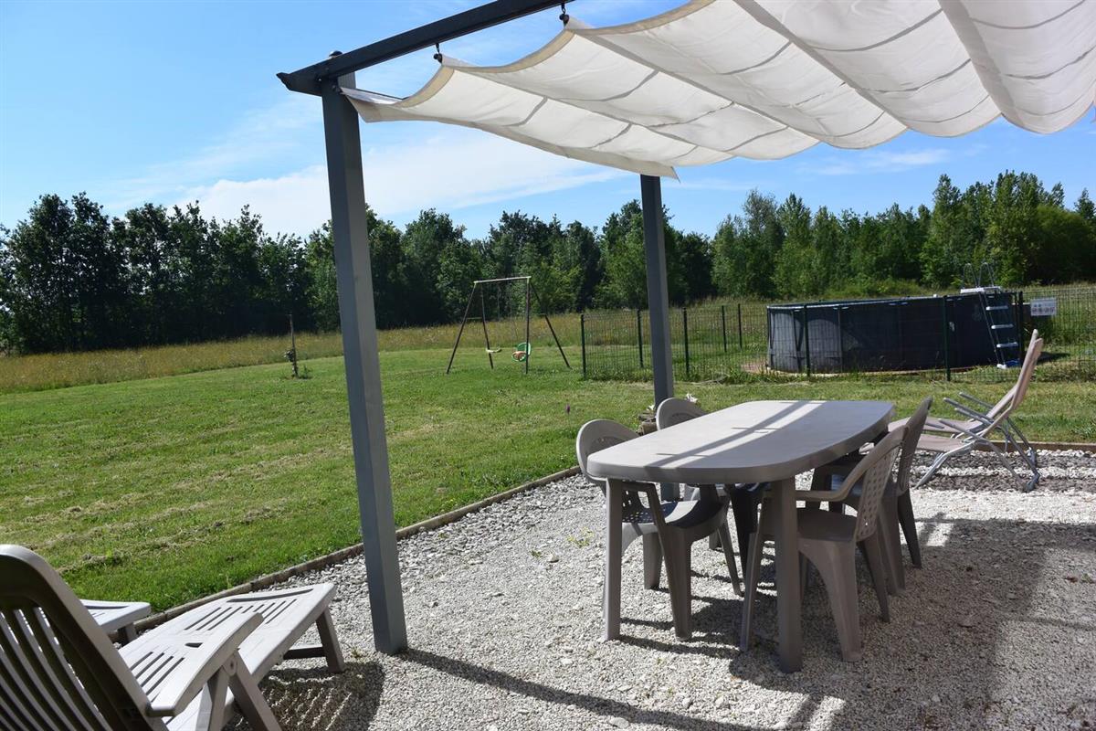 Une maison en campagne, un lieu paisible, une terrasse orientée sud-est, vue sur les collines les bois et les champs. Dès le matin géré par la tonnelle, le soleil s’invite sur la terrasse.