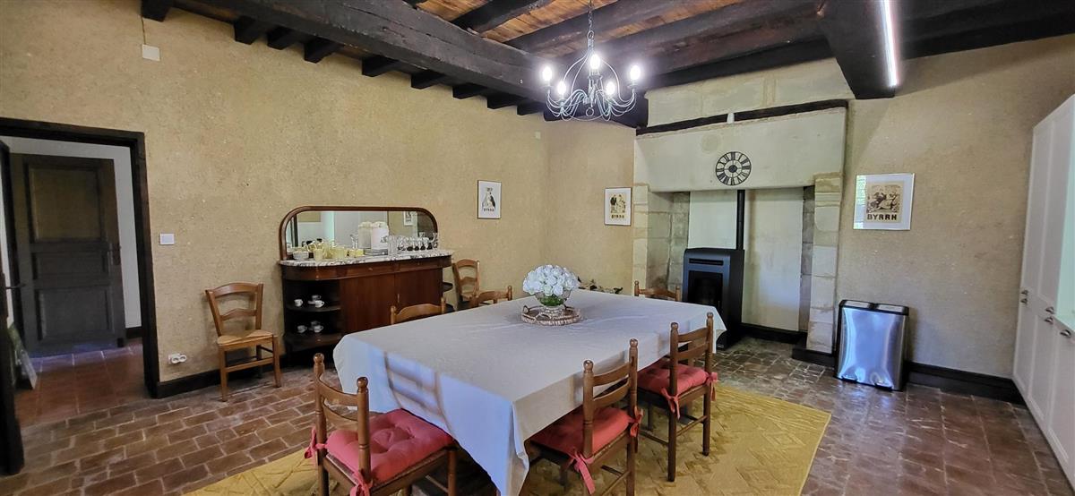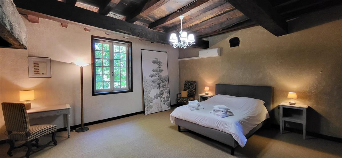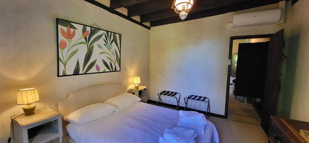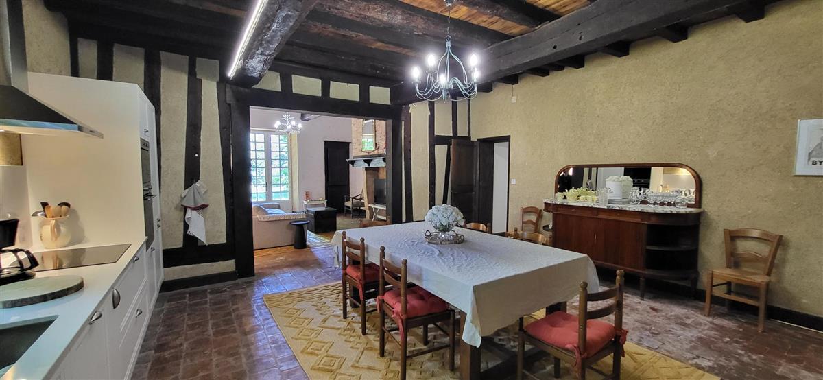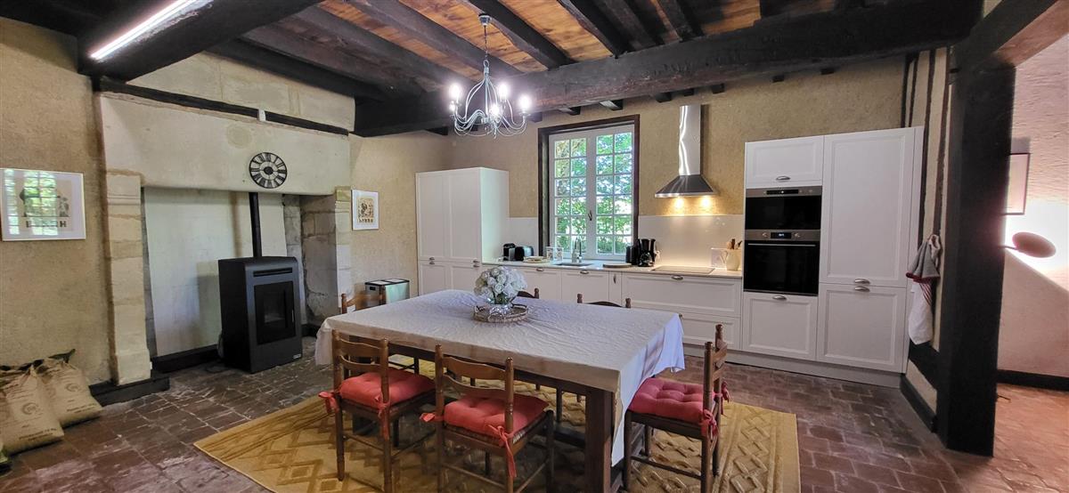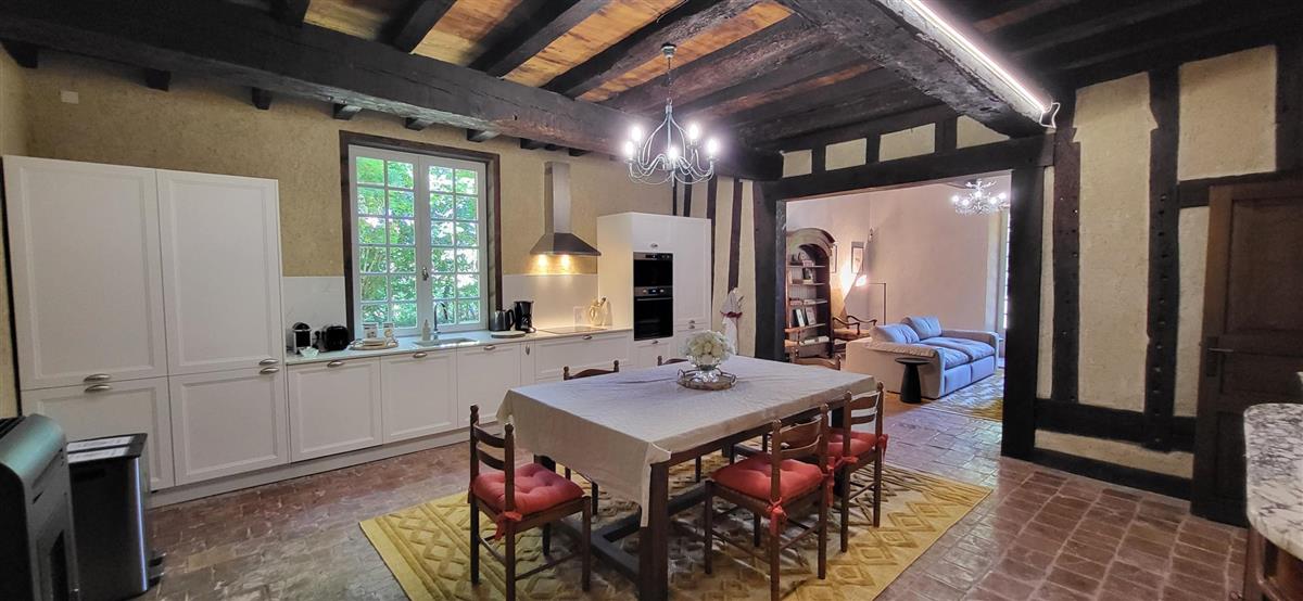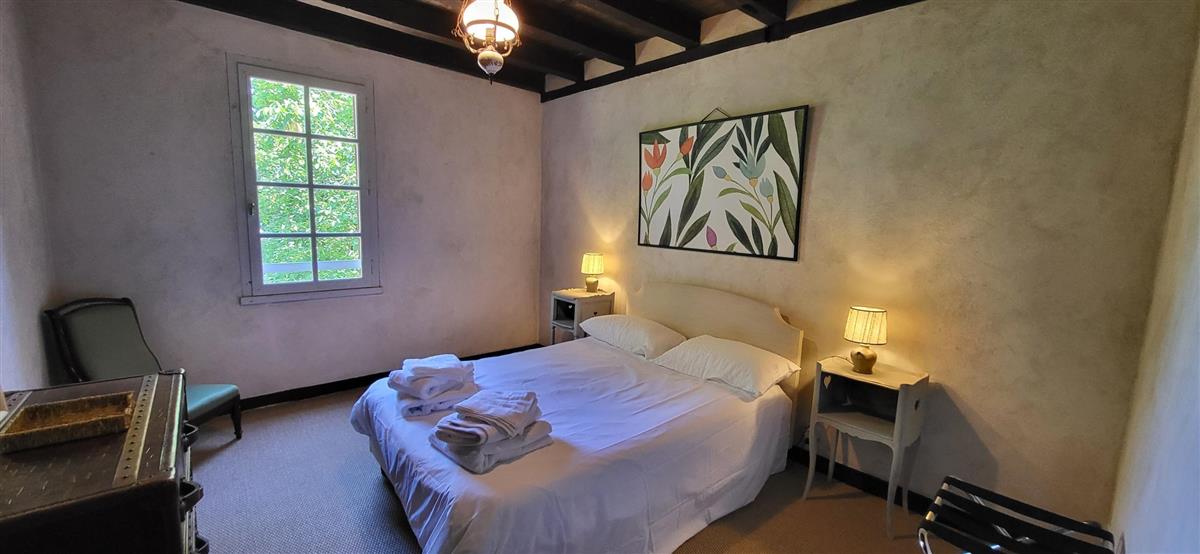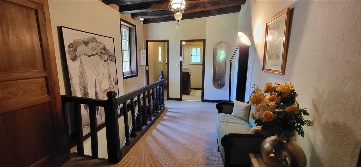 En rdc, une vaste cuisine équipée avec espace repas, salon alliant tradition et modernité, une salle d'eau avec WC. Depuis l'entrée, un escalier ancien équipé d'un monte-escalier automatisé, vous conduira à l'étage. La chambre 1 (1x160) et son coin salon, la chambre 2 à colombage (1x140 et 1x90) et la petite chambre 3 (1x140). Salle de bain et WC séparés. A l'extérieur, terrasse sous auvent et spa. Plus loin, devant la maison de maître, la piscine chauffée à partager avec le propriétaire qui saura être discret. Poêle à granule en rdc, clim réversible à l'étage.