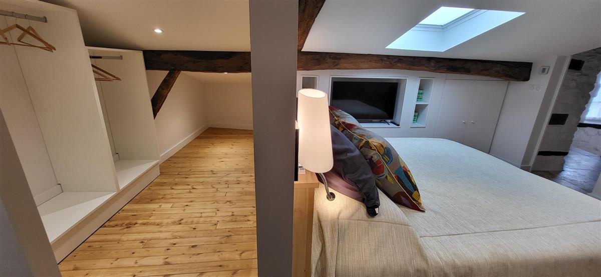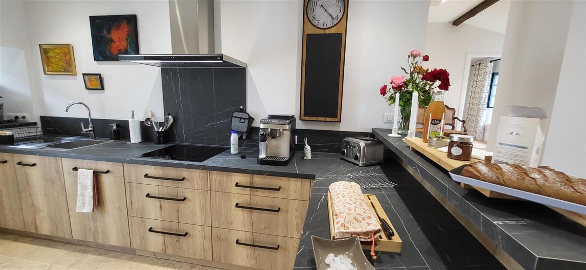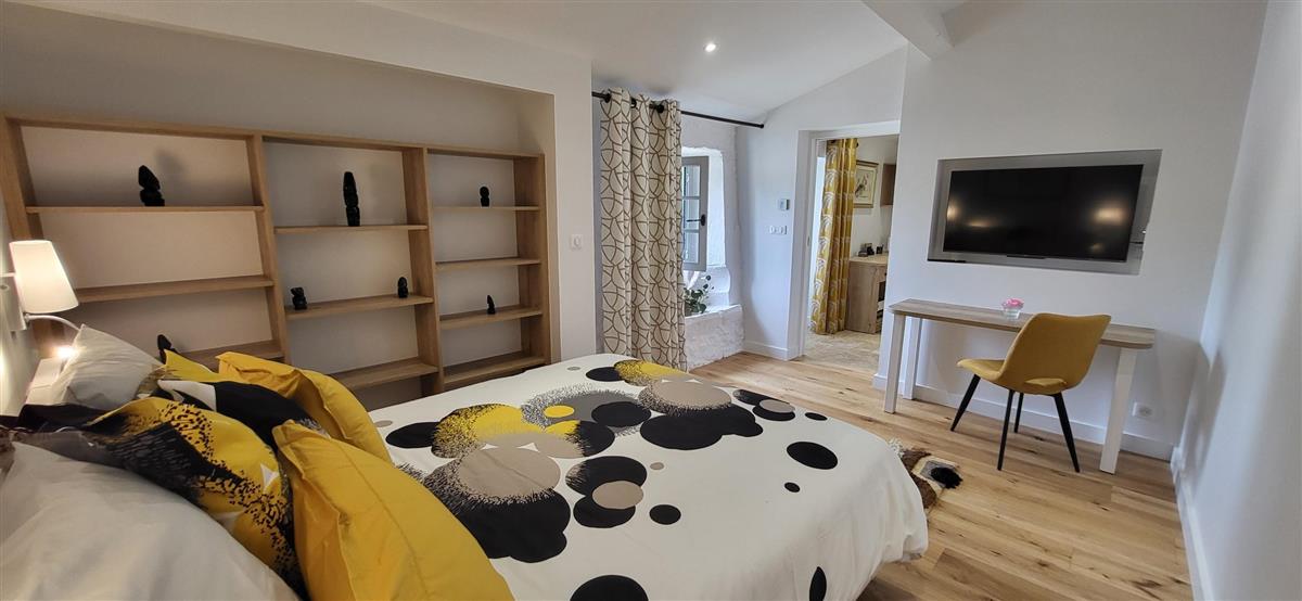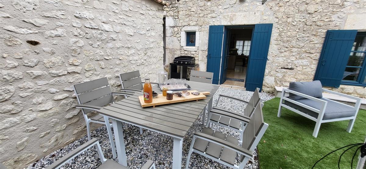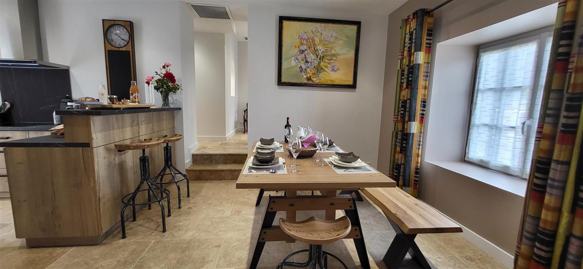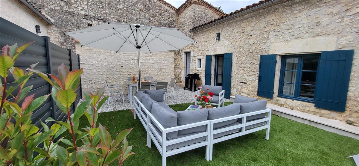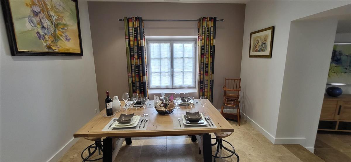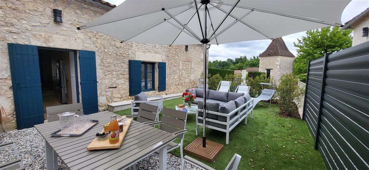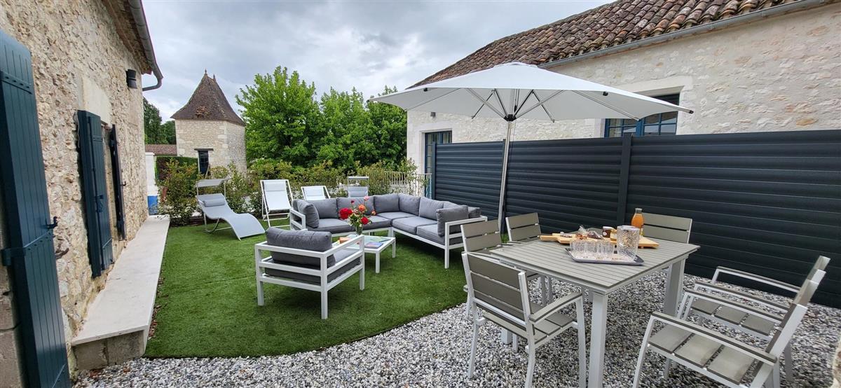 Sur un demi-niveau, la cuisine intégrée vous surprendra par son grand standing (cave à vin, réfrigérateur XXL, machine à café à grain), et son bar américain ouvert sur l'espace repas. Sur un autre demi-niveau, la première chambre (1x160) avec ses murs de pierre blanchis à la chaux, vous apportera un grand confort avec sa télévision et son dressing. Une salle d'eau avec WC lui est réservée sur ce même niveau, tout proche d'une pièce bureau et de l'espace buanderie (LL/SL). Côté vestibule d'entrée (dressing), un escalier en pierre et fer forgé vous mènera au cœur du pigeonnier, dans un univers vertical où la pierre blanchie rencontre le bois de la charpente ancienne : la seconde chambre (2x90 ou 1x180 - lits électriques) s'étire sur le reste de la longère, sous les toits. Avec sa télévision aussi, son petit coin salon et son dressing avec lit bébé parapluie, cette chambre est véritable petit cocon. La salle d'eau et son wc occupent la partie haute du pigeonnier, face à la chambre. Les draps (lits faits), le linge de toilette et le ménage de fin de séjour sont inclus pour vous procurer tranquillité. Wifi dans le gîte. A l'arrière de la maison, un jardinet avec salon de jardin, transats et barbecue plancha électrique, vous assure intimité, à l'abri des regards. La maison de maître, tout proche, demeure la résidence de vacances de son propriétaire. A deux pas, restaurant, terrains de tennis, et plus loin le lac de Castelgaillard, la forêt de St-Front et les vignobles du domaine d'Amblard.