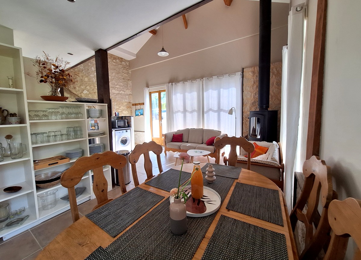 Maison de 90 m² comprenant une pièce principale avec espace cuisine, salon, salle à manger et WC. Accessible par le couloir, 2 chambres avec chacune sa salle de bain. L'une familiale avec 1 lit double (160) et 2 lits simples (90) sur sa mezzanine (escalier raide, peu recommandé pour les jeunes enfants). La seconde avec 1 lit double (160) possède un accès direct sur une terrasse aménagée. Une mezzanine au-dessus de la pièce principale est équipée d’un canapé lit avec coin télé. Piscine. Jardin non cloturé.