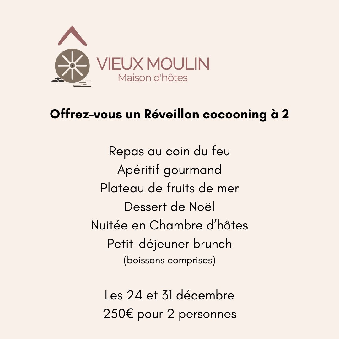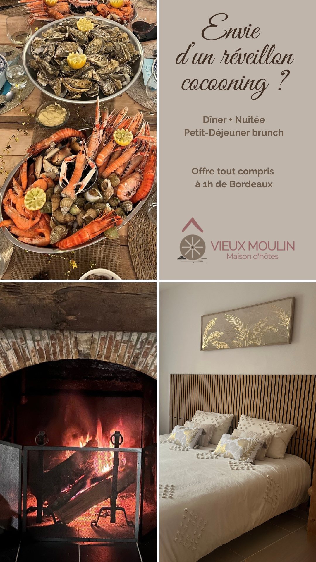 A partir de 95 euros/nuit pour 2 personnes petits-déjeuners inclus. : : Nous vous proposons un forfait tout compris pour des réveillons gourmands en toute simplicité ! : Au programme : - apéritif gourmand et coupe de champagne - plateau de fruits de mer et vins de propriété - dessert de Noël Nuitée dans l’une de nos 5 suites confortables avec lit King size : Petit-déjeuner brunch : Offre de fêtes de fin d’année disponible les 24 et 31 décembre 2025 au prix de 250€ pour 2 personnes ! :