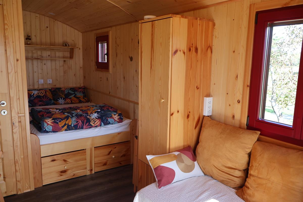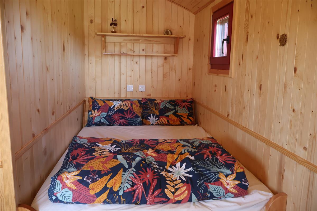 Chaque roulotte dispose d’une terrasse privée, d’une petite cuisine équipée, et d’une salle d’eau avec douche et toilette sèche. Le couchage comprend 1 lit 2 personnes (140 x 190 cm) avec oreillers 100% latex naturel à mémoire de forme et matelas à ressorts ensachés fabriqué en France et une banquette constituée de 2 lits simples empilables (80 x 200 cm).