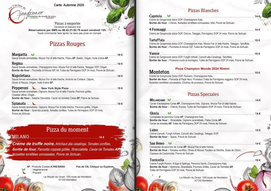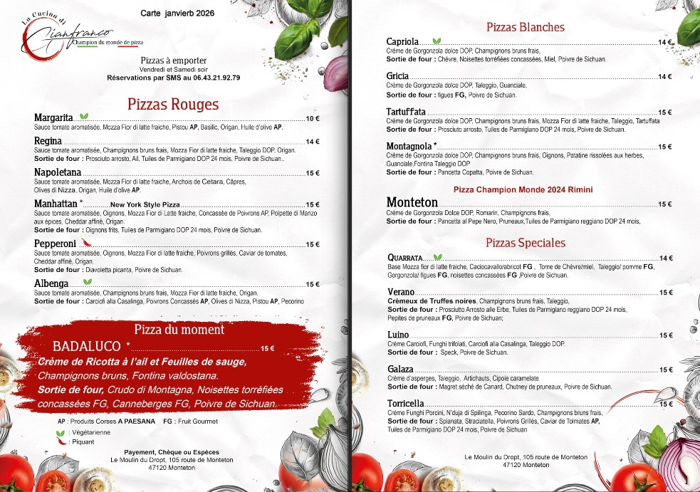 En 2024 Jean-François GIROLDI alias La Cucina di Gianfranco, remporte le titre de champion du monde avec sa pizza Monteton pruneaux et noisettes au championnat du monde de la pizza à Rimini, en Italie. Commandez vite !