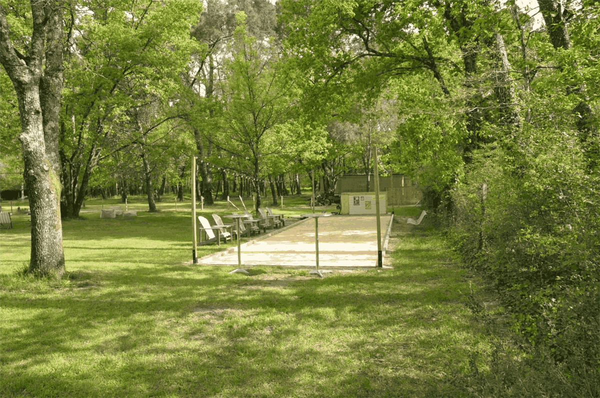 Nous vous proposons un large espace en plein air, dont une partie couverte, des jeux en bois pour petits et grands, un boulodrome, une table de ping-pong.